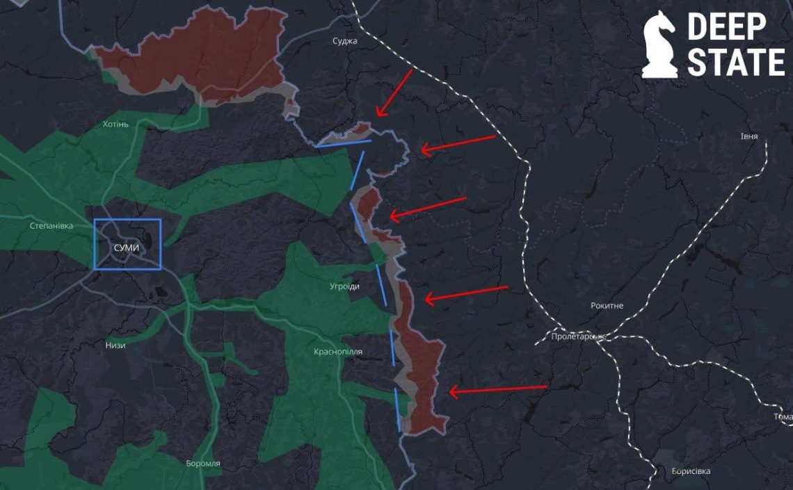 Противник продовжує формувати кількісну перевагу на кордоні з Сумщиною, здійснює тиск для просочування в глибину території та в першу чергу намагається закріплятися в зоні інфільтрації (тобто, сірій зоні) для контролю території вздовж кордону. На півночі від Сумщини особливих змін не відбулося”, – наголошують аналітики DeepState